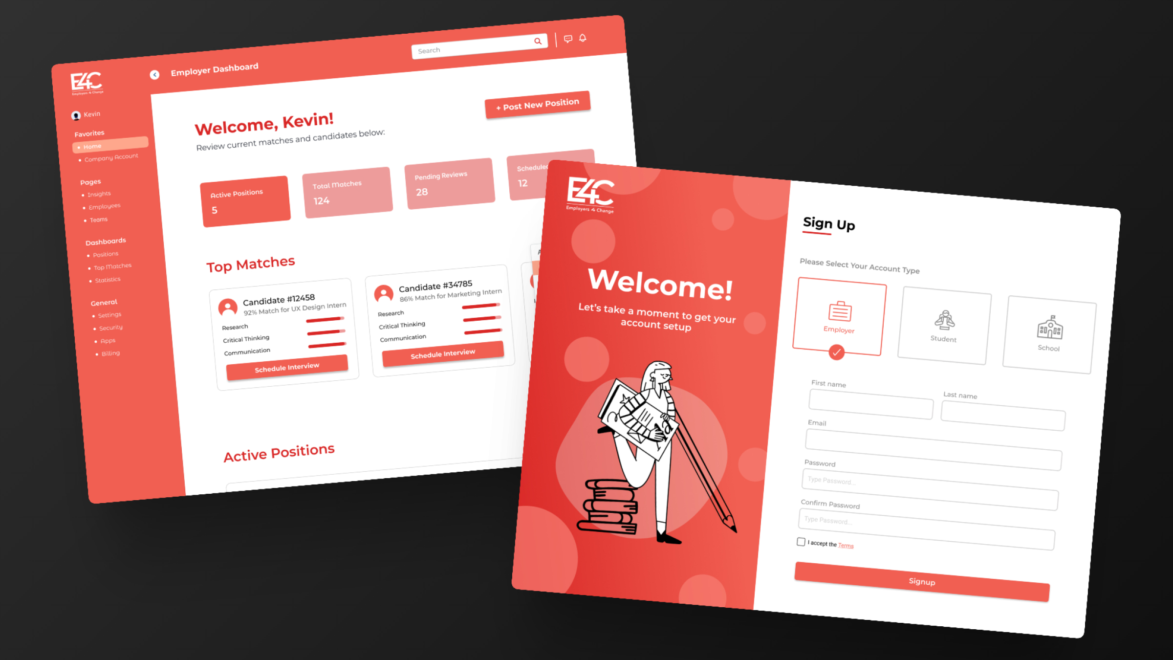 UX redesign for Employers 4 Change that streamlined onboarding for two user types, increased task completion, and established a scalable design system with a purpose-built employer dashboard